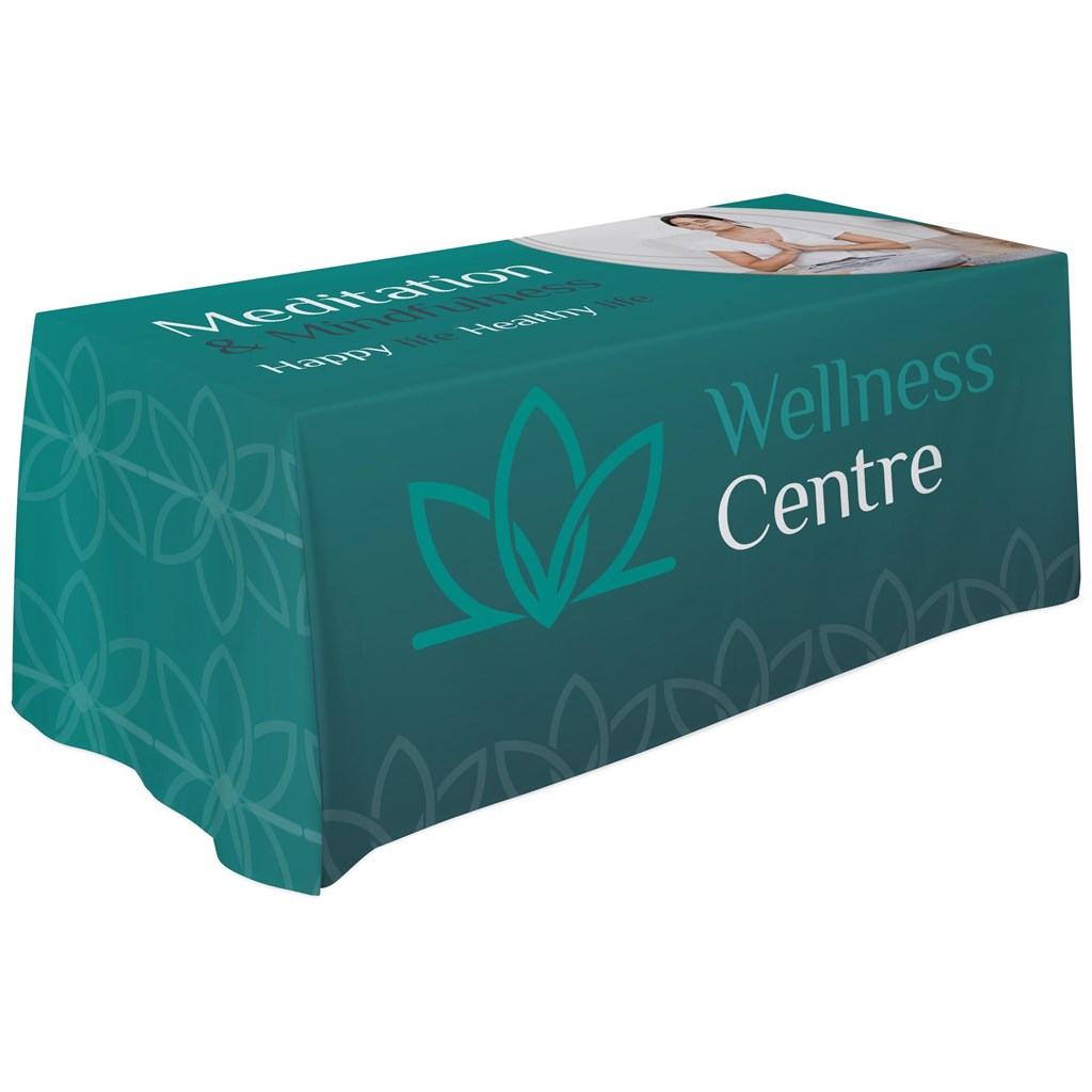 The polyester display fabric used for the tablecloth is known for its durability, resistance to wrinkles, and ease of care, making it a long lasting option. Additionally, the tablecloth is lightweight and easy to handle, which makes it easy to transport and set up. It is also washable, which makes it easy to clean after use.The edges of the tablecloth are hemmed to prevent fraying, which helps to extend the life of the product. The single sided sublimation branding means that the branding is printed onto the fabric using a sublimation printing process. This process ensures that the branding is long lasting and does not fade or peel off easily.Overall, the tablecloth made from polyester display fabric is a high quality product that is durable, lightweight, washable, and has a professional looking branding. It is an excellent choice for anyone looking to showcase their brand or message at events, exhibitions, or other promotional activities.